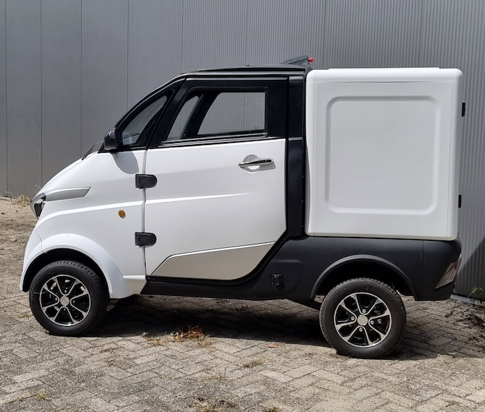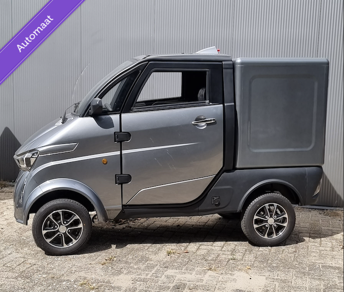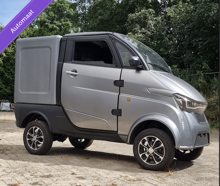 De Box Deze box is zolang de voorraad strekt voor deze actieprijs € 8450,-- ex btw leverbaar !! De Box is uitgerust met diverse comfort opties zoals verwarming, verstelbare stoel, bluetooth aansluiting, radio, compleet digitaal dashboard en als extra optie te bestellen ook met airco. Doordat de bestuurdersruimte volledig is afgesloten bied de Box bescherming tegen alle weersinvloeden. Opladen Geen extra laadpalen nodig maar eenvoudig aan te sluiten op het 220v stroomnet. De accu’s zijn na 4 uur volledig opgeladen. Binnen 2 uur is de accu vol genoeg (80%) zodat je weer op pad kunt gaan voor uw bezorgingen. Laadruimte De Box heeft een laadruimte van 1000 liter. De bak heeft geen vast indeling waardoor hij aangepast kan worden aan ieder zijn wens. Wij kunnen diverse indelingen voor u laten inbouwen. Een gekoelde laadruimte is ook mogelijk. In een gekoelde laadruimte kunt u de temperatuur tot 18 graden onder nul instellen. Smart Car De Box is er ook in de smart uitvoering. In deze uitvoering heeft u geen sleutels meer nodig om de auto te openen maar gaat alles via een app of token wat hem ideaal maakt om als share auto te dienen. Tevens heeft dit systeem een uitgebreid track en trace systeem waardoor u uw ritten nog efficiënter kunt inplannen. Alle informatie krijgt u binnen in een app of in een uw eigen online omgeving. Heeft hij onderhoud nodig of schade u meld het simpel en snel online. Bromfietsrijbewijs Om de Box te besturen heb je slechts een bromfietsrijbewijs nodig. Doordat de Box in deze categorie valt kunt u op alle bestemmingen binnen de stad leveren ook wanneer de straat is afgesloten voor auto’s. Even de Box parkeren op de stoep, geen probleem. Max snelheid 45 km/uur actieradius 100 km